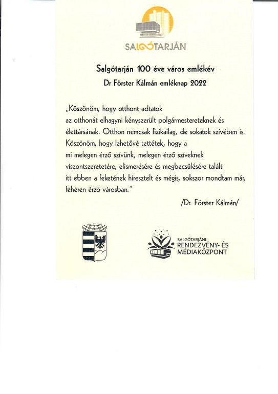 Salgótarján 100 éve város emlékév Dr. Förster Kálmán emléknap 2022